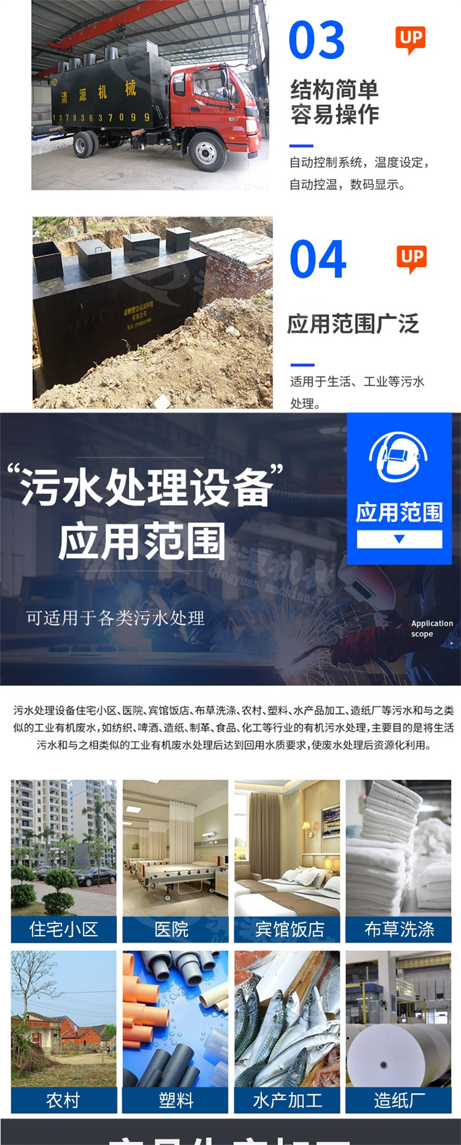 3、設備主要適用于住宅區、賓館、碼頭、機場、療養院、廠礦等行業的生活污水和類似的工業廢水。